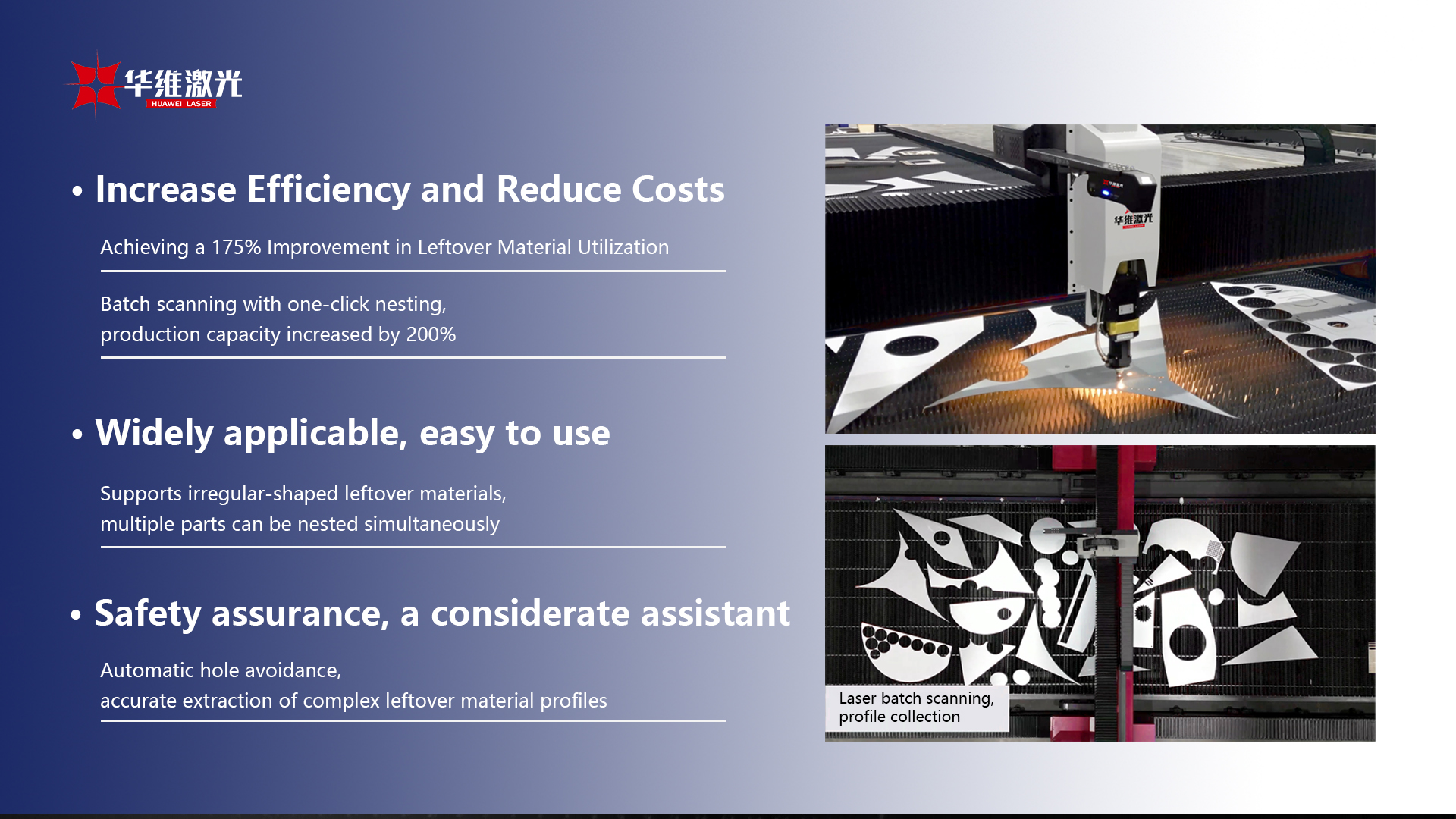 Sistem reutilisasi pintar Huawei Laser mampu memproses sisa -sisa yang tidak teratur, mengendalikan kontur kompleks dan melaksanakan bersarang yang tepat. Sama ada berurusan dengan bentuk bulat, segi empat tepat, atau pelbagai bentuk yang tidak teratur, sistem ini boleh mengenali dan mengoptimumkan pelan bersarang untuk memastikan penggunaan yang cekap setiap bahan. Di samping itu, sistem ini menyokong bersarang pelbagai bahagian, meningkatkan kecekapan pengeluaran sambil mengekalkan ketepatan pemotongan dan mengurangkan masa pemprosesan.